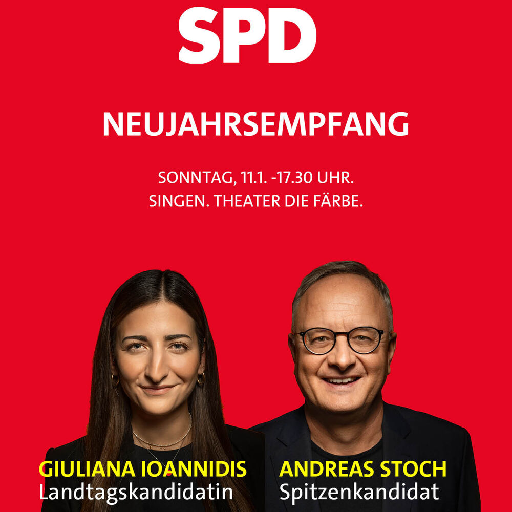 Der SPD-Spitzenkandidat für die Landtagswahl, der Landes- und Fraktionsvorsitzende Andreas Stoch, ist Hauptredner auf dem Neujahrsempfang, zu dem die SPD Singen herzlich einlädt. Er findet am Sonntag, den 11. Januar 2026 um 17.30 Uhr im Theater "Die Färbe" (Schlachthausstraße 24, SIngen) statt.
